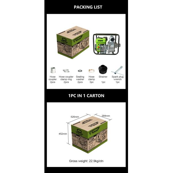 With low fuel consumption and low noise, this VIDO 3 inch 6.5hp gasoline/petrol water pump is mainly applied to the work in farm, factory, other work.